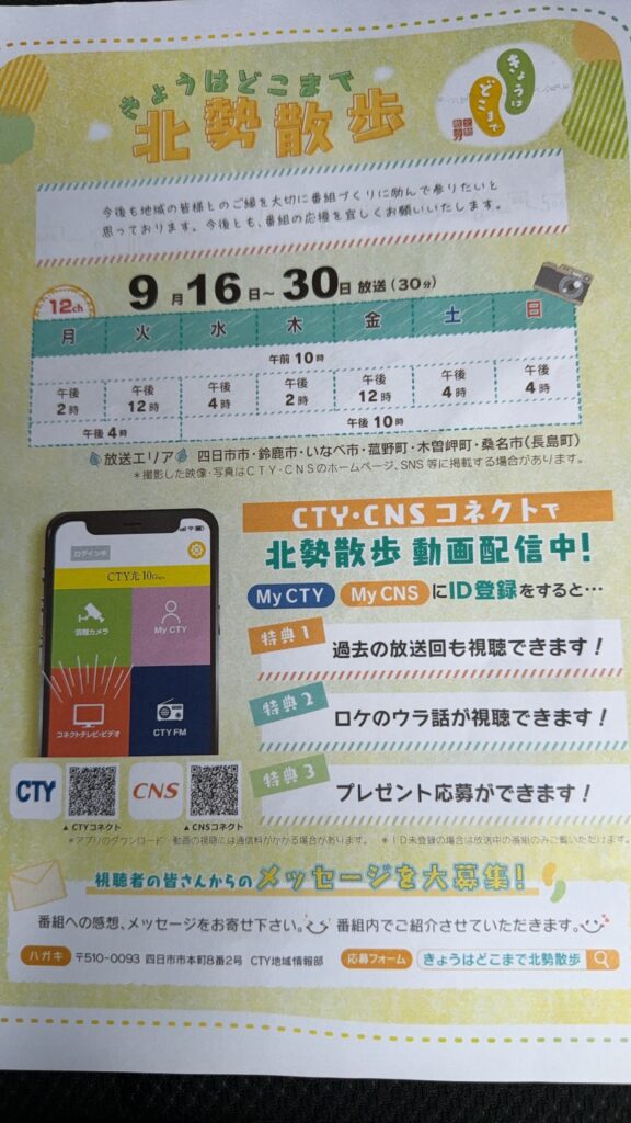 四日市ケーブルテレビCTY・CNSの12チャンネルで、22:00〜や10:00〜の時間帯で放送されます